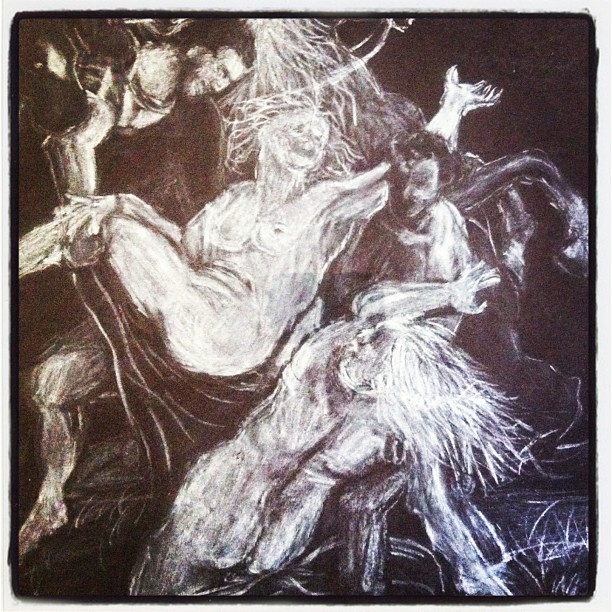 My white charcoal version of Rubens’ Rape of the Daughters of Leucippus, 1618.