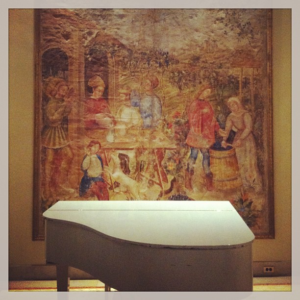 Looking to design your foyer ? Try a piano and ancient tapestry.